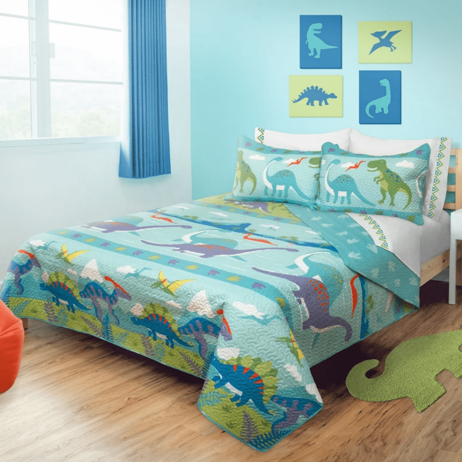 Give your child's bedroom a fun and refreshing new look with this dinosaur printed bedding set.